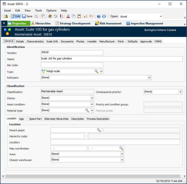 4. In the Type list, select an asset type that has the setting “Assets of this type are used as scales for measuring gas container weight”. The Asset window changes accordingly. For example: