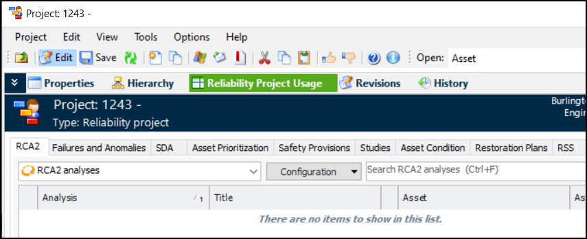 Note: This functionality is generally available. You must first enable feature 99 to use the functionality in APM. In the Enterprise window, select the Features view and the Enabled Features tab. Click Browse, select “Support for reliability projects” and click OK. If APM is running as a smart client, click Refresh Enabled Features on the server. Then restart the client to use the functionality.When Reliability project is selected in the project type, the Project window displays the Reliability Project Usage view, which lists the objects linked to the project. For example:Project Tasks
