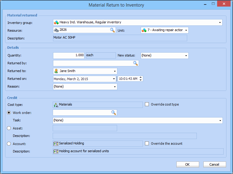 6. Right-click the unit and select Return to Inventory. The Material Return to Inventory dialog appears. For example: