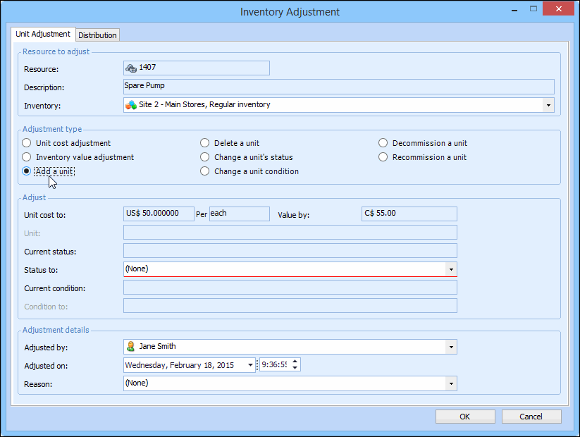 3. Right-click the serialized resource that you are adjusting and select Adjust Item. The Inventory Adjustment dialog appears.