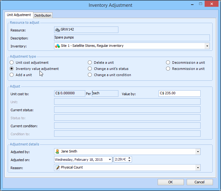 3. Right-click the serialized resource and select Adjust Item. The Inventory Adjustment dialog appears.