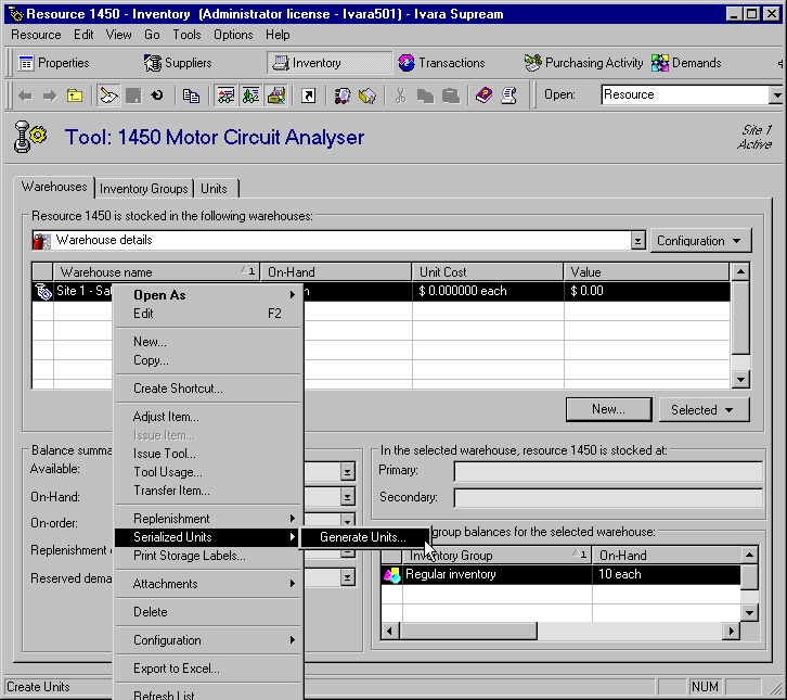 4. On the Warehouses tab, right-click the warehouse for which you are creating units, and then select Serialized Units > Generate Units.