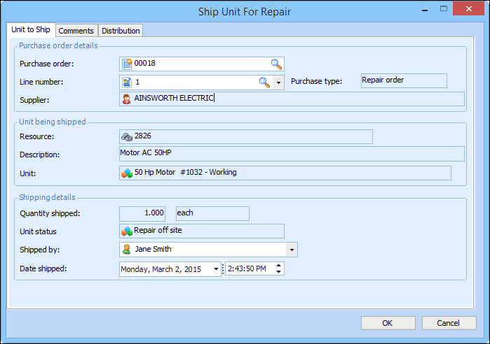 2. Select the General tab, and then the Lines tab. Right-click the purchase order line that you want to change and select Ship unit for repair. The Ship Unit for Repair dialog appears.
