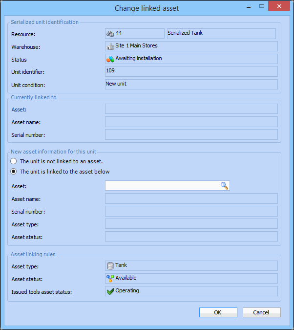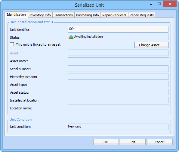 9. Click OK. The asset is now linked to the serialized unit, and the unit is identified by its unique identifier. For more information, see Setting up Unit Identification for Repairable Spares.