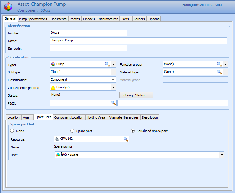 To link the asset to a serialized resource unit, select the Serialized spare part option.