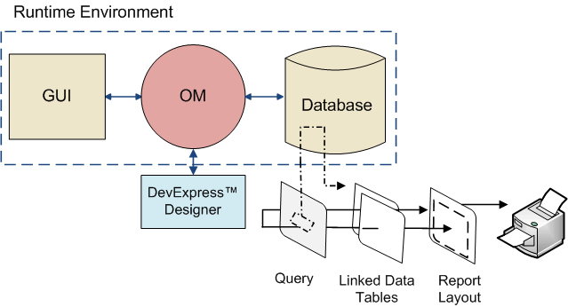 Report generation in APM has been implemented by tying the reporting features of the DevExpress Reporting™ reporting tool into the object model. The object model can be viewed as the “hub” that links the user, the reporting tool, and the database together. This link provides the necessary mechanisms that allow each element to contribute to the generation of a report. Using the object model as the conduit, users can initiate the design of a report.Selecting Data for the Report