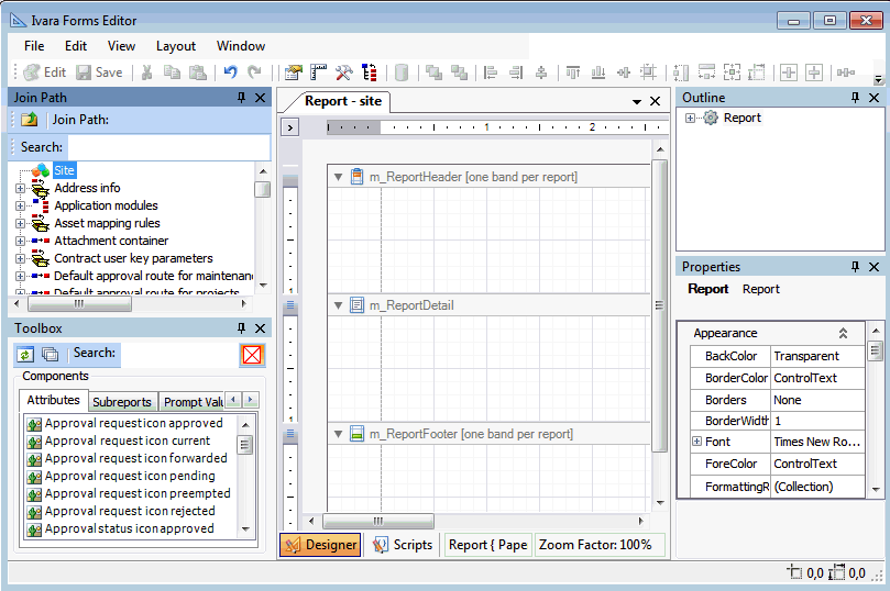 Customize Reports: Using this function, you can create, edit, preview, and print customized reports, as well as view and print reports that come with APM. These reports are saved in the database so that you can access them through APM whenever necessary.When you create a custom report, you can specify whether the report is accessible from the site’s Reports menu or on an object’s menu, such as Strategy Development reports.Editing in Report Designer