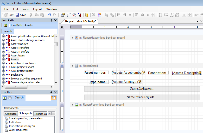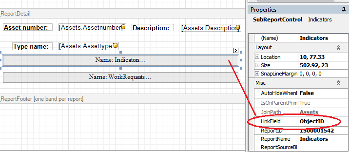 4. Select a subreport in the Report Detail band and then, in the Properties panel, scroll to the Misc section and select LinkField. The DataFieldEditorForm dialog opens. Select ObjectID as the field that will link the subreport to the main report.Note: When linking subreports that were customized from a standard APM report, the ReportID and ReportName in the Properties panel, Misc section displays the ReportID and ReportName of the original APM report, rather than the customized report name. Likewise, the Report definition window, Sub Reports tab displays the ReportID of the APM standard report, not the name of the customized report. This is reference only and does not affect functionality.