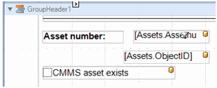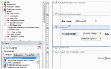 5. The Toolbox panel, Attributes tab lists the attributes related to the join path. Click the attribute to add to the report and drag it onto the layout panel detail (or GroupHeader) band. For example, add the CMMS asset exists attribute to the report.