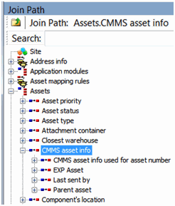4. To select an attribute from the class that owns the data group, select an option in the Join Path panel, expanding the join path hierarchy if necessary. For example, you can add CMMS information for an asset to the report.