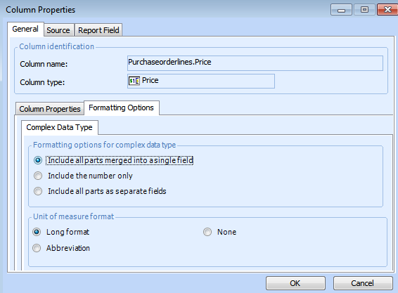 • Include all parts as separate fields: Only the value is displayed and the unit of measure is hidden. Note to display the unit of measure, add the “UnitOf_...” calculated field from the list of calculated expressions by dragging the label control from the accessory into the detail band of the report.
