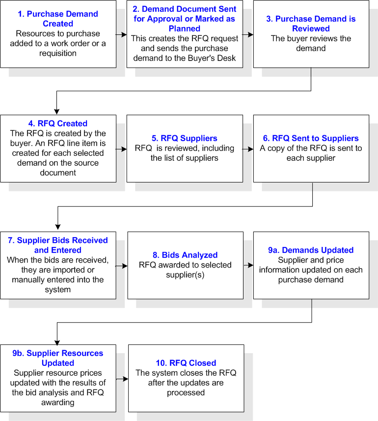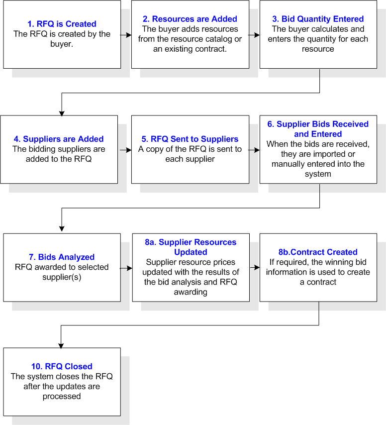 Once quotations are requested for purchase demands, the buyer can review the requests through the My Desk view and then create an RFQ document. For each resource, the RFQ identifies the quantity required, delivery requirements, and any special terms or conditions required. The RFQ also defines the bidding process, the deadline by when the bids are required, and contact information.Bid-Sheet (Catalog-Price) RFQs
