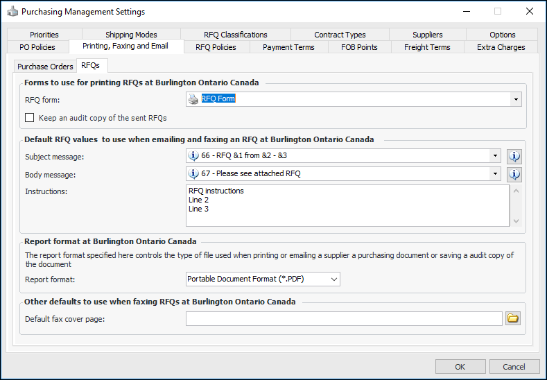 • Bid Instructions: The bid instructions, as entered on the General tab of the RFQFor email and fax transmission, you can specify the messages that will be used for the subject line and body. These are defined for the site in the Purchasing Management Settings, Printing, Faxing and Email tab, RFQs tab.Using Email and Excel