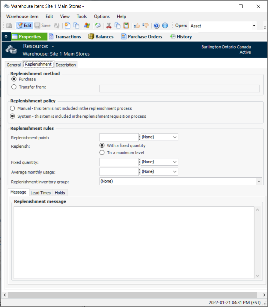 Manual: Select this option if a manual review will be conducted to determine the need to replenish the item. The item will not be included when the Create a replenishment requisition action is run.System: Select this option if APM will determine the need to replenish the item when the Create a replenishment requisition action is run for the warehouse.