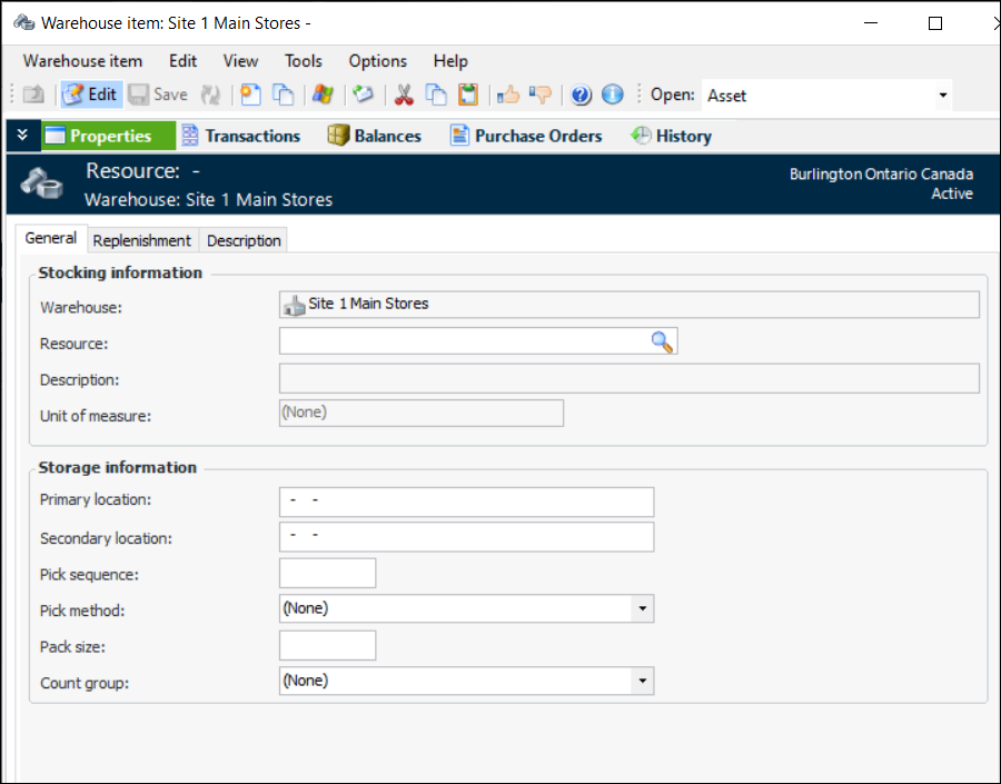 3. Click New. The Warehouse Item window appears.