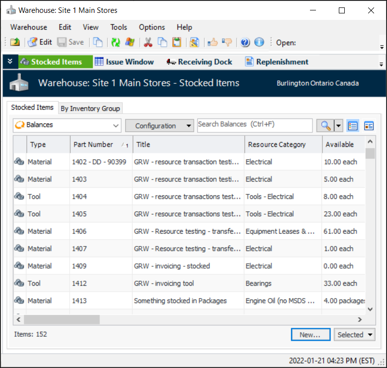2. On the Warehouses tab, double-click the warehouse that you want to add items to. The Warehouse window opens displaying the Stocked Items view.