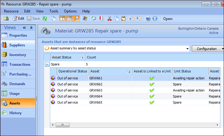 2. Select the Assets view. This view displays the asset summary by asset status. You can expand a status to view assets with that status.