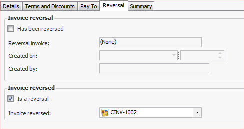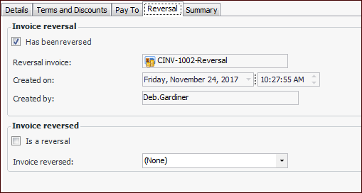 2. In the Invoice window, select the Properties view, General tab, Reversal tab to view the reversal invoice. For example: