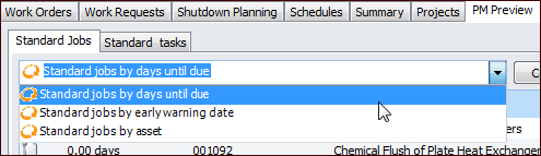 2. Select the PM Preview tab and the Standard Jobs tab to view jobs arranged by days until due. In the configuration list, you can select “by early warning date” or “by asset”.