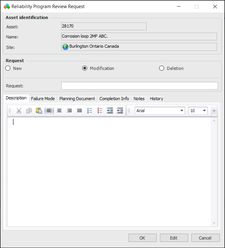 1. Right-click the asset, standard task, task template, standard job, job task, or indicator in a table, click Reliability Program Review, and then New Request. The Reliability Program Review Request dialog appears. For example: