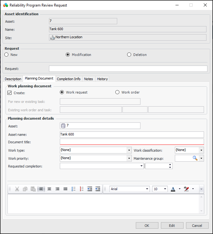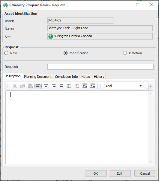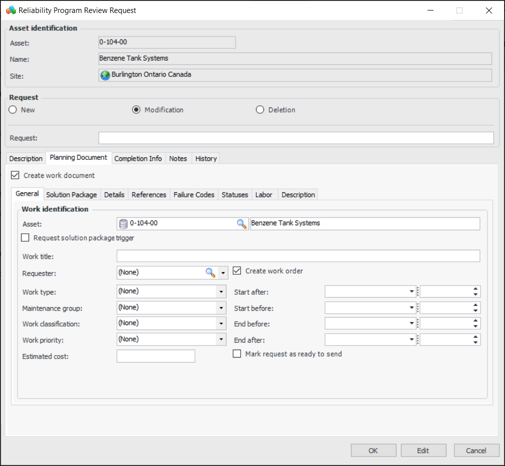 6. Click OK to create the request and close the dialog.To Work with Reliability Program Review Requests