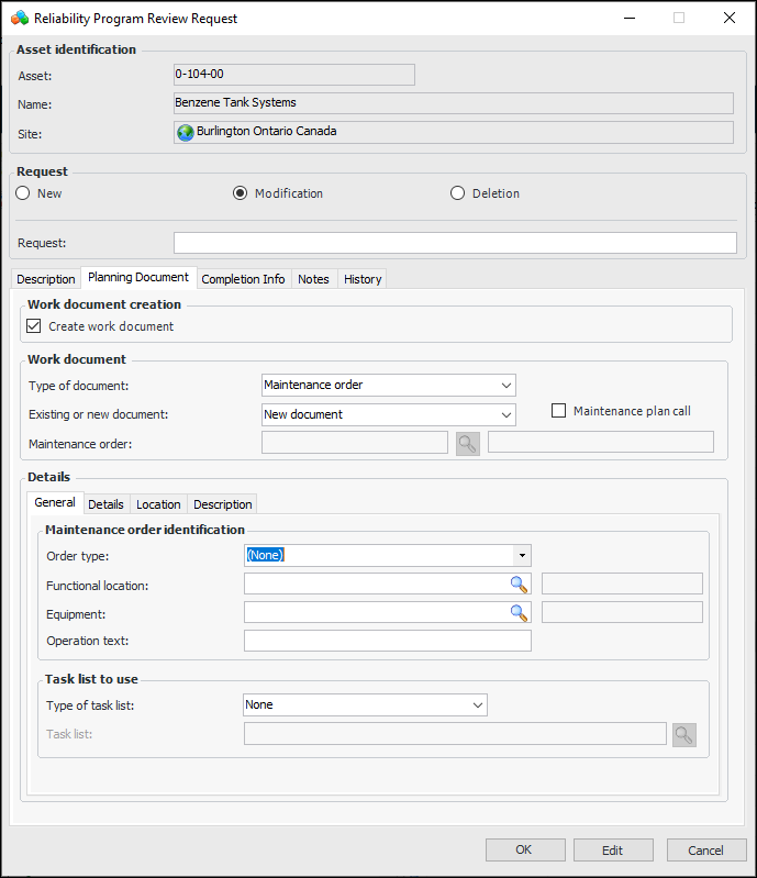 • In the review request, add a maintenance order or notification as the planning document. The document is created or updated in SAP when you click OK, so there is no need to process the requestYou can also create reliability program requests on strategy development analyses. For more information, see Reviewing MTA2 Assets’ Reliability Programs.To View Upcoming Work for the Site
