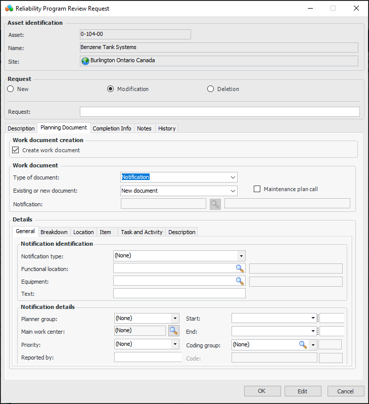 1. You can add a planning document at this time. The notification is updated or created in SAP when you click OK. Select the Planning Document tab and click Create work document. For example:
