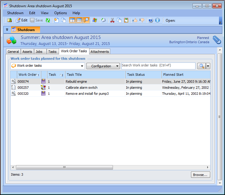 4. When you have finished reviewing the Assets, Jobs, Tasks, Work Order Tasks, and Attachments tabs, close the shutdown dialog.To View Upcoming Work for an Asset