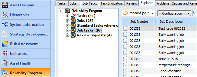• Select the Reliability Program view and the Explorer tab. This tab displays a tree with nodes for jobs, standard tasks and the static indicators collected on them, job tasks, and review requests. Click a node to see its contents in the table to the right. For example: