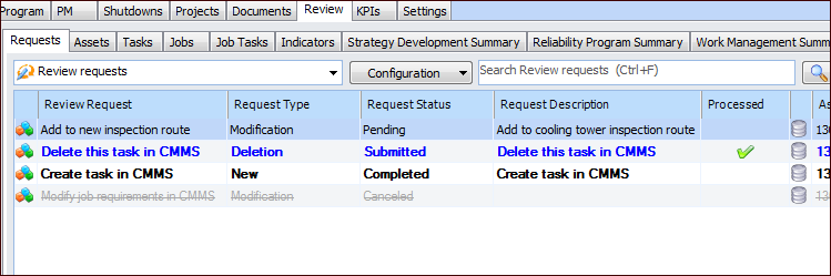 1. In the Site or Asset window, select the Reliability Program view, Review tab, and Requests tab. This tab lists requests made for assets, standard tasks, standard jobs, job tasks, and indicators. Here is an example from the Site window:Note: If APM has been configured to interact with SAP Plant Maintenance, the site’s interoperability profile can specify that only the CMMS system’s reliability program is used. In that case, the Jobs, Job Tasks, and Work Management Summary tabs are not displayed. Similarly, if AWEIS is active, the Jobs and Job Tasks tabs are not displayed.Tip: To view requests according to type of object, select the Assets, Tasks, Jobs, Job Tasks, and Indicators tabs.Tip: To view requests in a Standard Task, Standard Job, or Indicator window, select the History view and then the Review Requests tab.