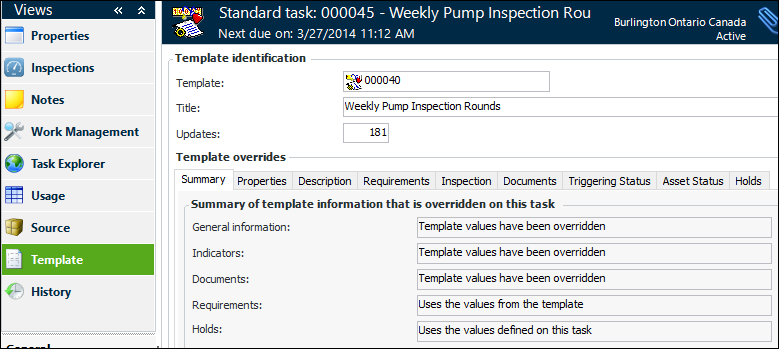 3. Select the Template view and the Summary tab. This tab shows which types of information have been overridden on the standard task. The other tabs compare the standard task with the template.