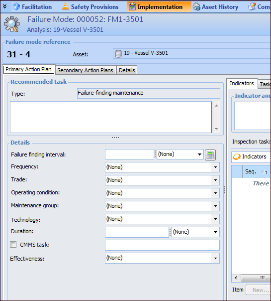 1. On the analysis’ Facilitation view, double-click the failure mode to open the Maintenance Action Plan window.