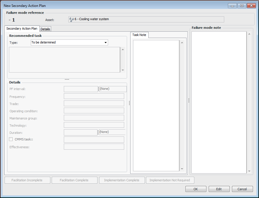 6. Click New. The New Secondary Action Plan window appears.Note: If APM is configured to interact with a SAP Plant Maintenance system, System condition and Work center are available in the Details area.