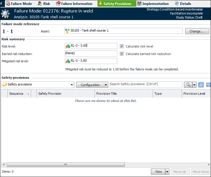 1. Open the Maintenance Action Plan window. In the Failure Mode view, ensure that a strategy has been selected. This makes the Safety Provisions view available in the window.