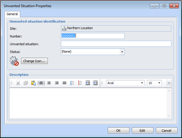 2. Click New. The Unwanted Situation Properties dialog appears.Tip: After the unwanted situation has been used, the Failure Modes tab is available in this dialog. It lists the failure modes that reference the unwanted situation.