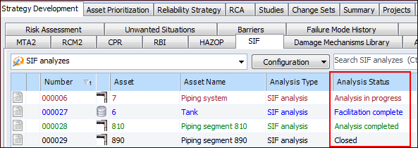 You can keep track of the strategy development process by monitoring and changing the status of analyses and failure modes. For example, the site’s Strategy Development view and tab, SIF tab displays the statuses of the analyses in the Analysis status column:To view the statuses of failure modes, open the analysis, select the Facilitation view and then the Failure Modes tab. The Action plan status column displays each failure mode’s status. For example: