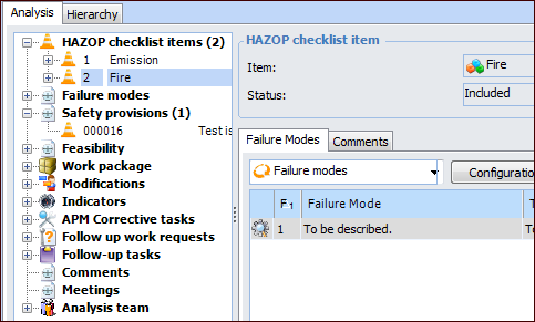 • To take a comprehensive look at the analysis, select the Safety Explorer view. Select the Hierarchy tab to view assets and their failure modes. The Analysis tab displays a tree of the items associated with the analysis, such as HAZOP checklist items, failure modes, safety provisions, indicators, and team members. The table to the right shows information about the item selected in the tree. For example, select a HAZOP checklist item to see its failure modes:
