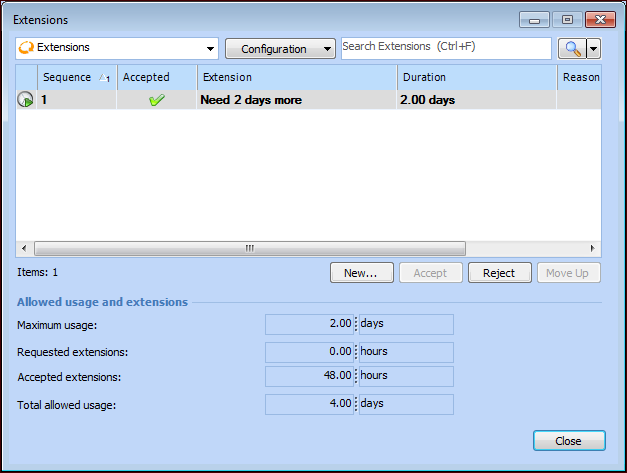 1. Select the Timeline tab and click Extensions. The Extensions dialog lists existing extension requests. For example:If approvals are required, the Accept and Reject buttons are not available. Instead, send the incident for approval. Otherwise, you can accept and reject extensions using these buttons.Tip: You can change the order of extensions using the Move Up button.
