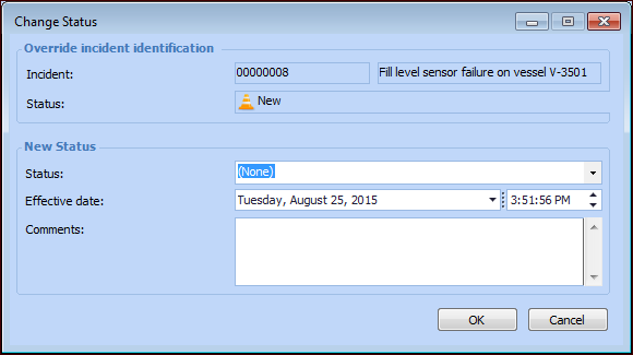 9. The status describes the incident’s stage of development. Whenever you wish to set a status manually, click Change Status. The Change Status dialog appears. For example:Select a new status from the list, enter the reason for the change in the Comments box, and click OK. The date and time when the status went into effect are shown on the Status Details tab, along with your comments.