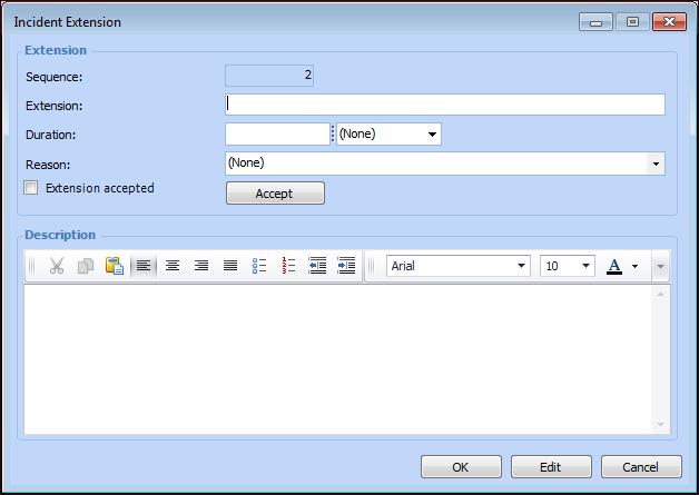 2. Click New. The Incident Extension dialog appears.The sequence number is automatically assigned. If you are using the approval process, the Accept button is not available.
