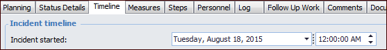 When Automatically updated as started is selected on the safety type, the specified safety status is applied to the incident.An incident’s start date and time are shown on the Override Incident window, Properties view, Timeline tab. For example:Tip: You can manually perform the scheduled action’s tasks using a command on the site. On the Site window, click the Tools menu, Safety Management, and then Update Open Override Incidents. APM updates the remaining time on all open override incidents. It also reviews open incidents that have not yet started to determine if their planned start dates are in the past and their safety types allow start dates to be set automatically. It sets each qualified incident’s start date and time to its planned values.To Create an Override Incident