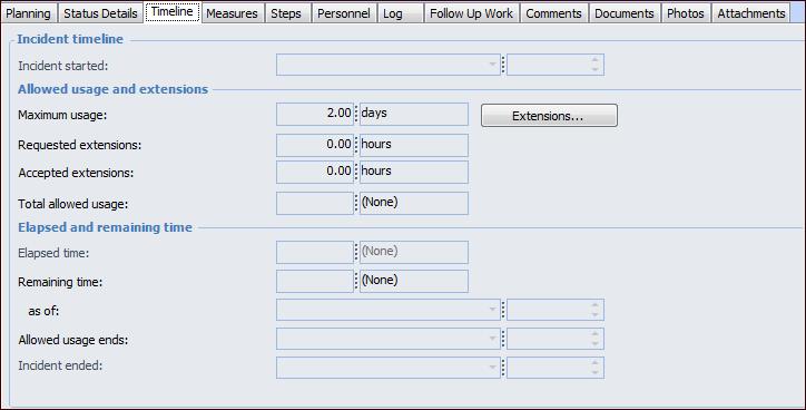 9. Click Close to close the Extensions dialog. If the extension was accepted, the information on the Timeline tab is updated immediately. If the incident must be sent for approval, this information is updated when the incident has been approved.