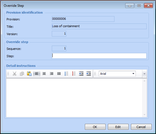 6. Select the Steps tab to add the steps performed when the override is used. Click New to add a step. The Override Step dialog appears:
