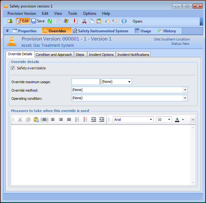 This topic explains how to add an override to a safety provision. For information about creating provisions, see Creating a Safety Provision.To Create a Safety Override