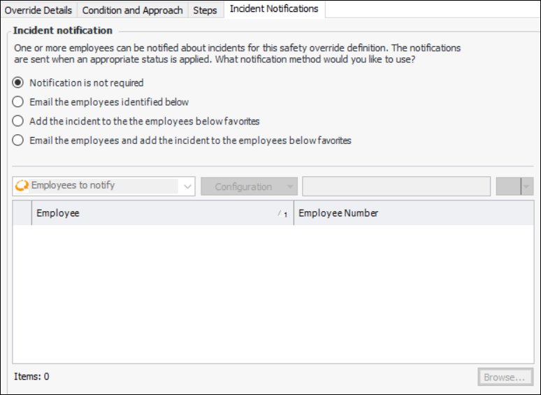 9. Select the Incident Notifications tab. You can select employees to be notified when an incident is created for this override.