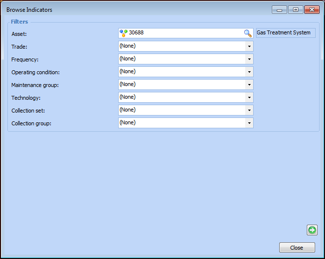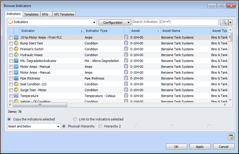 17. Select the Indicators tab to link or copy indicators to the provision’s asset. Click Browse to select indicators, key performance indicators (KPIs), or templates. The Browse Indicators dialog appears. For example: