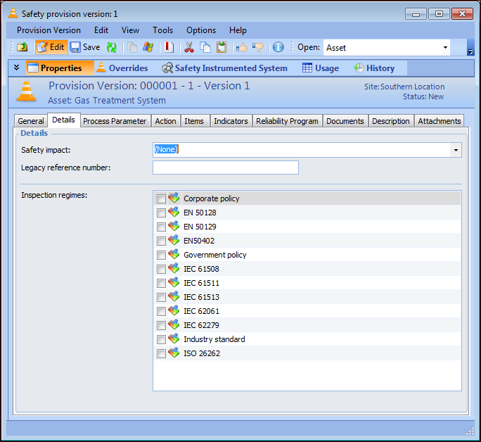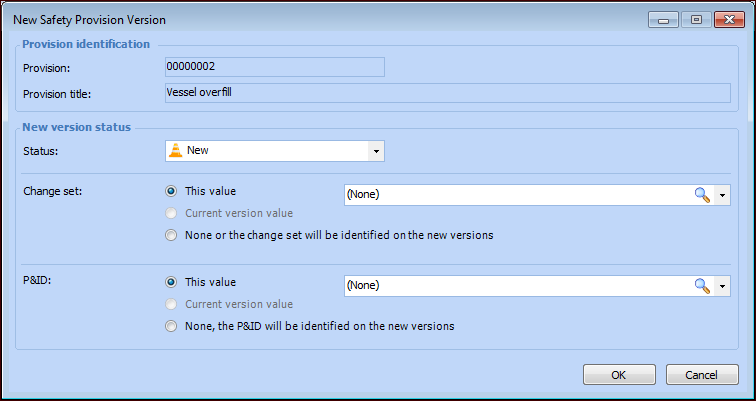 Tip: Once the provision has been added to SIF or HAZOP analyses, you can view the list of failure modes in the Safety Provision window’s Usage view. For a version, select the Usage view in the Safety Provision Version window to see a summary of the high risk scores taken from all of the failure modes that cite the version. If you wish to update this information, click the Tools menu and then Update Risk Levels.Note: You can set up a scheduled action (Update Safety Provision Risk Levels) to update this information in provision versions. For more information, see Scheduling Actions.Tip: If a provision is not linked to failure modes, you can set the highest risk level yourself. In the Safety Provision Version window, select the Usage view. Select the level in the Highest risk level list, which is enabled when the provision has not been added to failure modes.Tip: You can quickly create versions for two or more provisions that do not already have drafts. Select the provisions in the site’s Safety Management view, Provisions tab. Right-click and click New Version. The New Safety Provision Version dialog appears, where you can select a status and options for the change set and P&ID document. This information is applied to all of the new versions. When you click OK, Safety Provision Version windows open for each of the new versions.Mandatory, Optional, and Unavailable Information