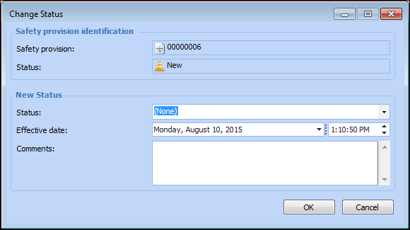 8. Whenever you wish to apply a status to the version manually, click Change Status. The Change Status dialog appears, where you can select the status, adjust the effective date, and add comments. When you click OK, the change is made on the Safety Provision Version window, where the effective date and comments are also shown.