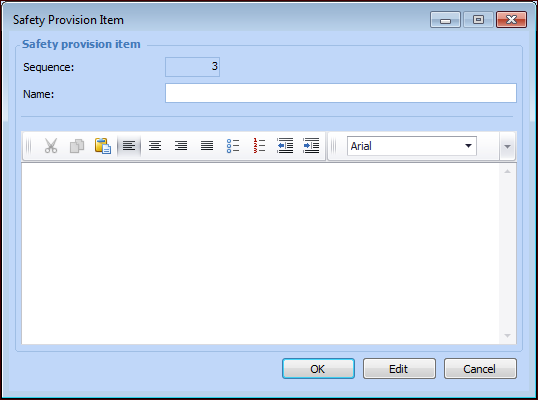 16. Select the Items tab to create a checklist of items. Click New to create an item. The Safety Provision Item dialog appears.Provide a name and description for the item and click OK. The item is added to the Safety Provision Items table.Tip: To change the sequence of an item, select it in the table and click Move Down or Move Up, as needed. The sequence numbers change accordingly.