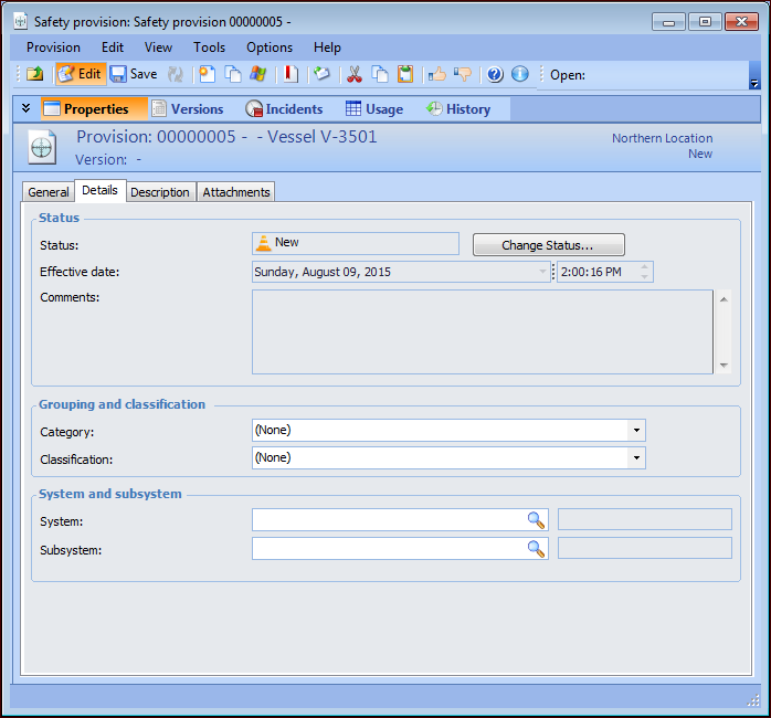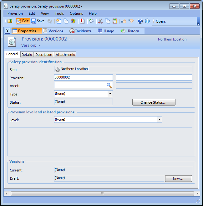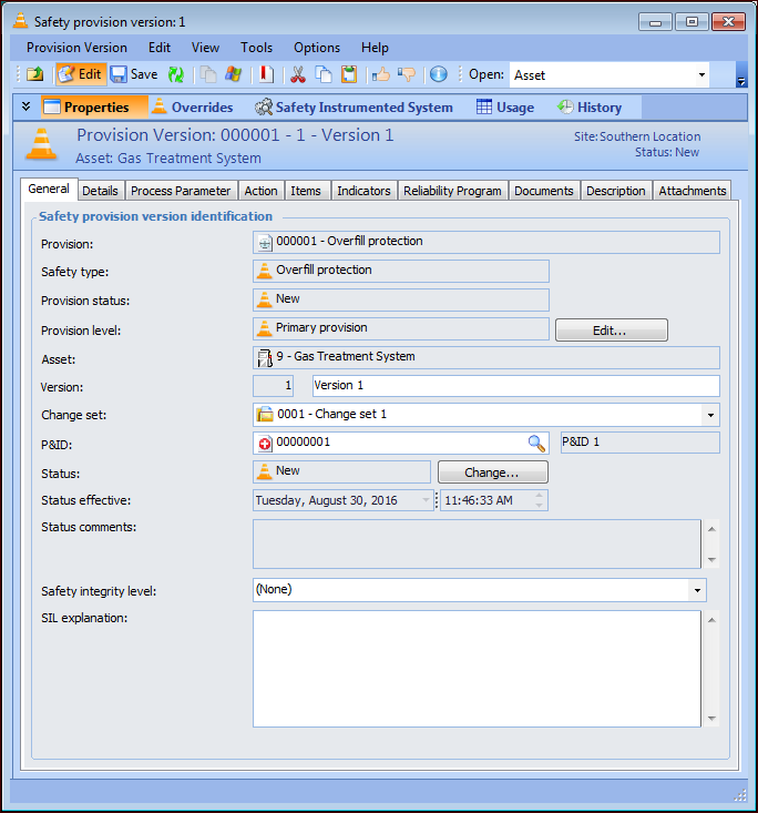 27. When you are finished, save the version and close the Safety Provision Version window. The version’s title is shown in the Safety Provision window’s General tab in the Draft box. For example: